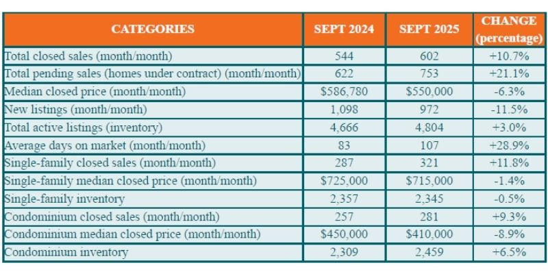 Closed sales in September increased 10.7 percent to 602 closed sales from 544 closed sales in September 2024. Monthly closed sales activity since June outperformed the same months in 2024. Yet, even as improved sales activity is beginning to chip away at the overall inventory, which increased 3 percent in September to 4,804 properties from 4,666 properties in September 2024, new listings have lagged in recent months – decreasing 11.5 percent in September to 972 new listings from 1,098 new listings in September 2024.